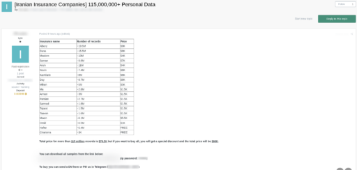 - July 2023 – Breach of multiple insurance firms: Asia Insurance (25,799,452 records for $10,000), Razi Insurance (11,015,722 records for $4,000), Sina Insurance (6,013,416 records for $1,500), and Hafez Insurance (431,947 records). The data allegedly included: name, surname, date of birth, father’s name, phone/mobile number, ID number, national code and more.