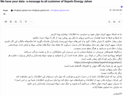 بر اساس ایملی که به دست ما رسید، گروه هکری انانیموس دوباره شرکت سپهر انرژی جهان را مورد هک قرار داده و دسترسی به اطلاعاتی از داخل شرکت پیدا کرده است و در نتیجه تعداد زیادی اسناد محرمانه شرکت سپهر انرژی جهان در سایت simorgh.io منتشر شده است.