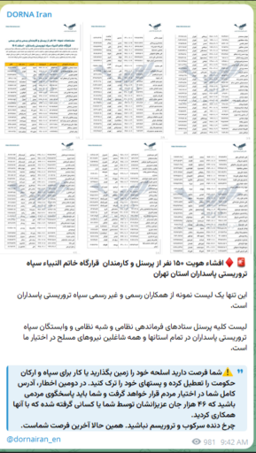این یک کانال کم آشناست که ادعا میکند دسترسی به هویت و مشخصات شخصی عضو سپاه پاسداران و کارمند قرارگاه خاتم النبیاء پیدا و نمونهای از این اطلاعات را منتشر کرده است. شایان ذکر است که این گروه در پیامی به اعضای نیروهای نظامی ایران خاطب میکند که «شما فرصت دارید اسلحه خود را زمین بگذارید یا کار برای سپاه و ارکان حکومت را تعطیل کرده و پستهای خود را ترک کنید. در دومین اخطار، آدرس کامل شما در اختیار مردم قرار خواهد گرفت و شما باید پاسخگوی مردمی باشید که ۴۶ هزار جان عزیزانشان توسط شما یا کسانی گرفته شده که با آنها همکاری کردید.»