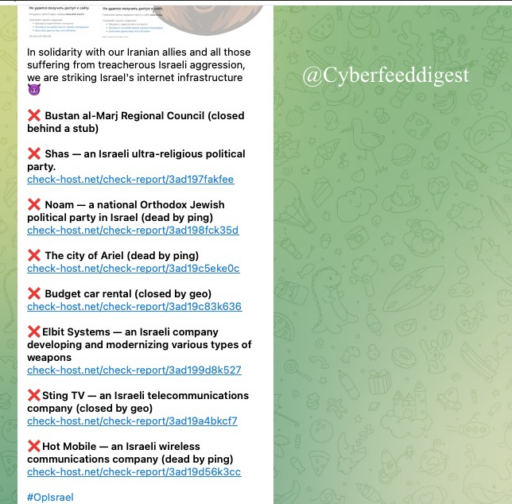 این گروه که به زبان عربی « الجبه الاسناد السیبرانیه» شناخته میشود در کانال تلگرام خود اعلام کرده است که در واکنش حملات به ایران، اهداف زیرساختی آمریکا و اسرائیل مورد حمله قرار خواهد داد.