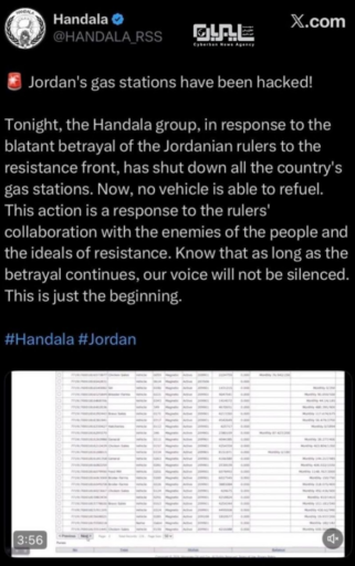 گروه حنظله که وابسته به وزارت اطلاعات و امنیت است، از آغاز جنگ، یکی از پرفعالترین گروههاست و ادعا میکند که به خاطر «نقش خائنانه خود در حملات آمریکا به ایران، به تمام پمپ بنزینها سراسر اردن حمله و آنها را از دسترس خارج کرده است. لازم به ذکر است که این ادعا تاکنون تایید نشده است.